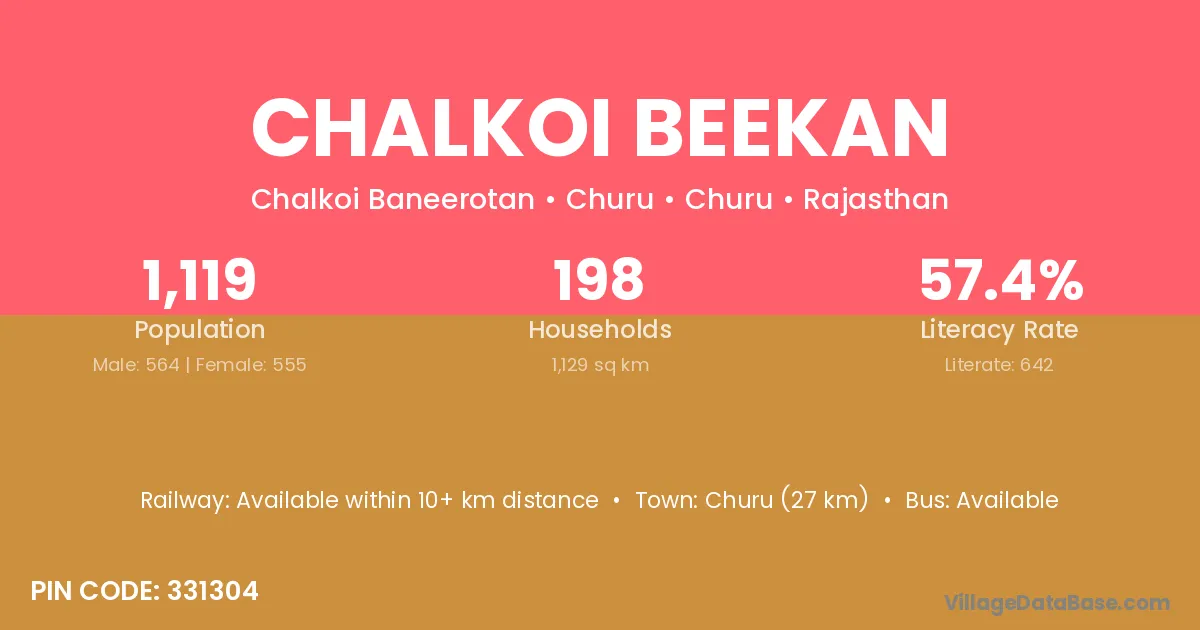 Churu (27 km) is the nearest town to Chalkoi Beekan village for major economic activities and is located approximately 27 km away.
