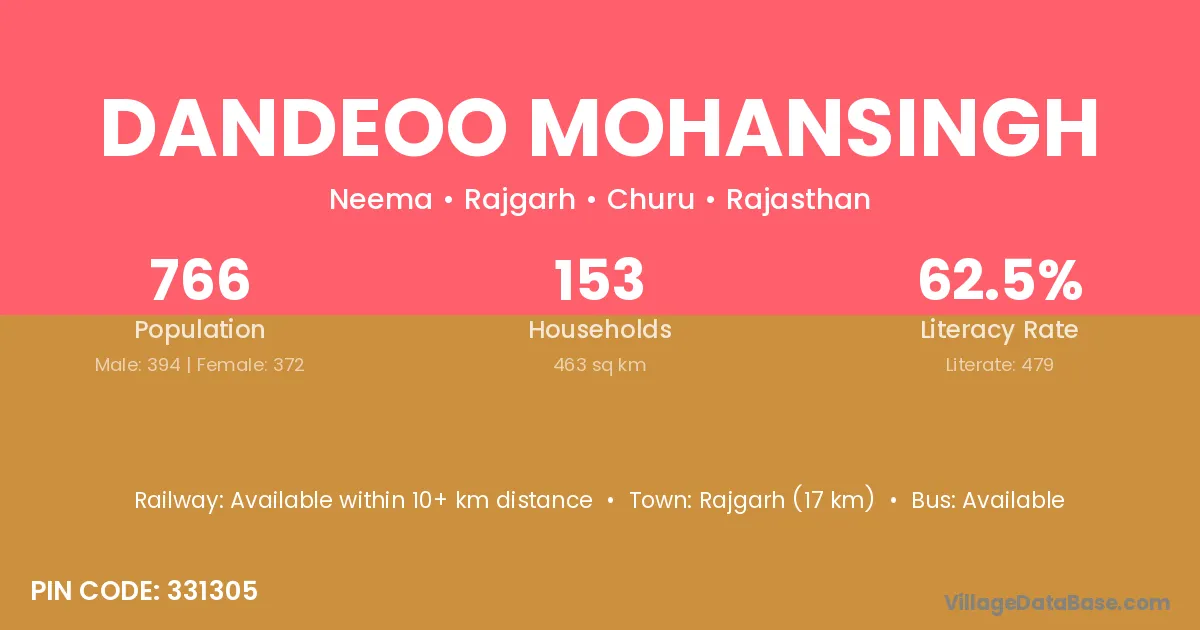 Rajgarh (17 km) is the nearest town to Dandeoo Mohansingh village for major economic activities and is located approximately 17 km away.