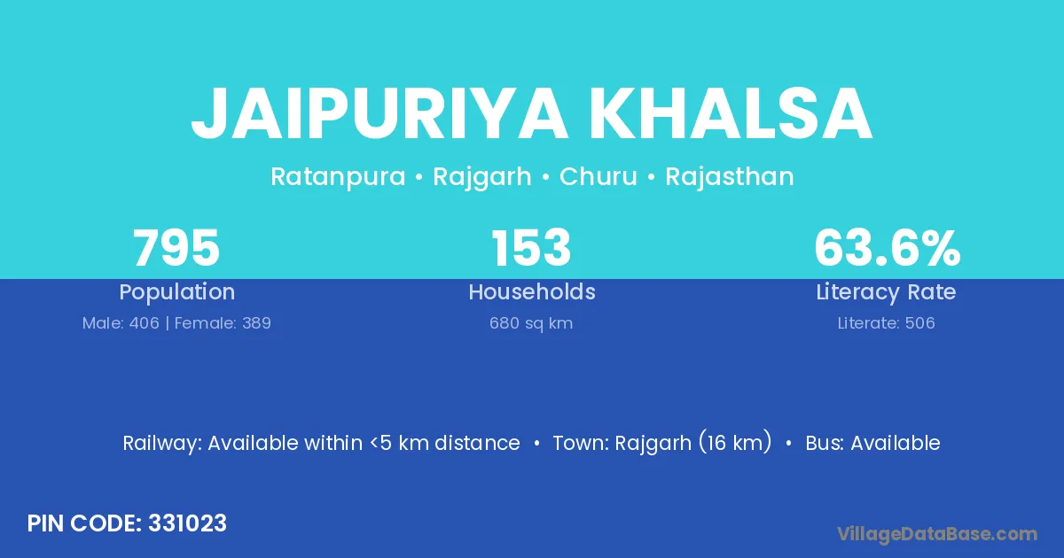 Rajgarh (16 km) is the nearest town to Jaipuriya Khalsa village for major economic activities and is located approximately 16 km away.