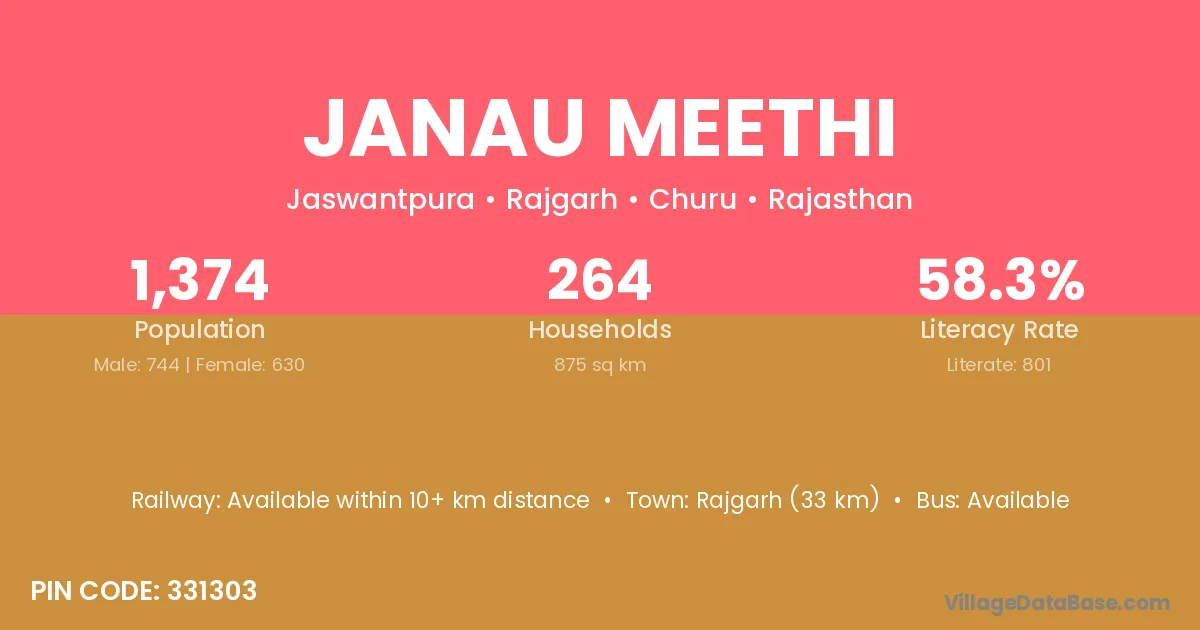 Rajgarh (33 km) is the nearest town to Janau Meethi village for major economic activities and is located approximately 33 km away.