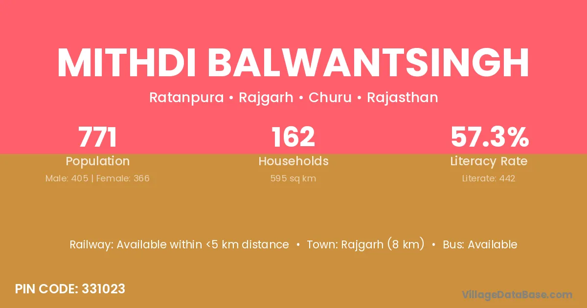 Rajgarh (8 km) is the nearest town to Mithdi Balwantsingh village for major economic activities and is located approximately 8 km away.