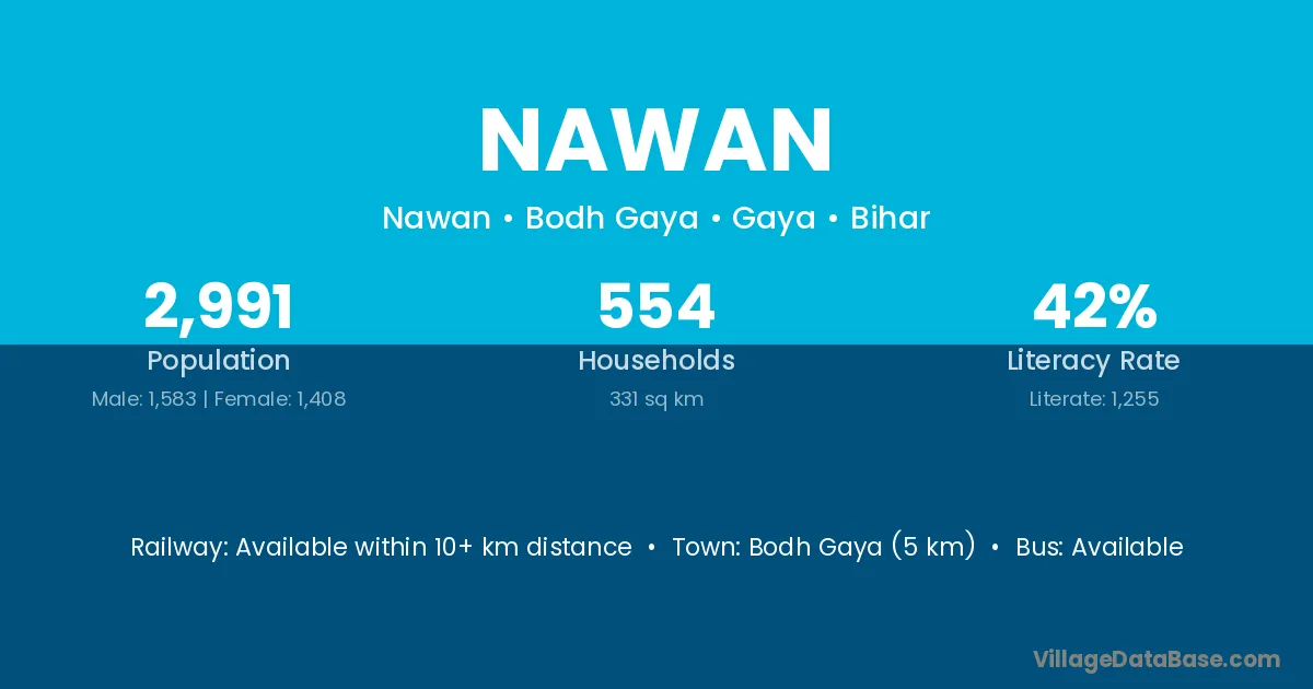 The literacy rate of Nawan village is 60.19%. Male literacy stands at 70.11% and female literacy at 49.14%.