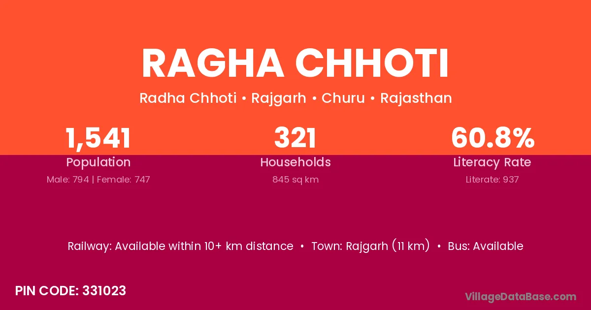 Ragha Chhoti village has a total population of 1,541 people, of which 794 are males and 747 are females.