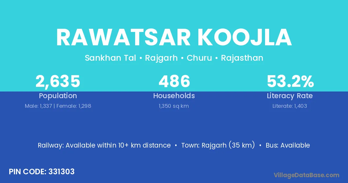 Rajgarh (35 km) is the nearest town to Rawatsar Koojla village for major economic activities and is located approximately 35 km away.