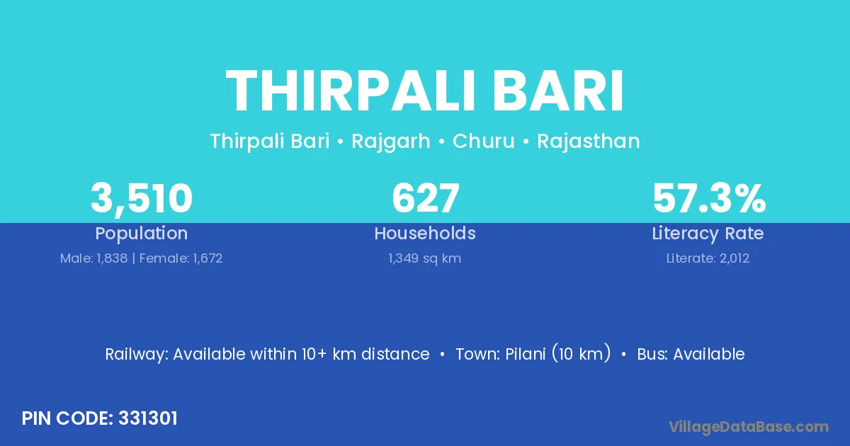 Pilani (10 km) is the nearest town to Thirpali Bari village for major economic activities and is located approximately 10 km away.