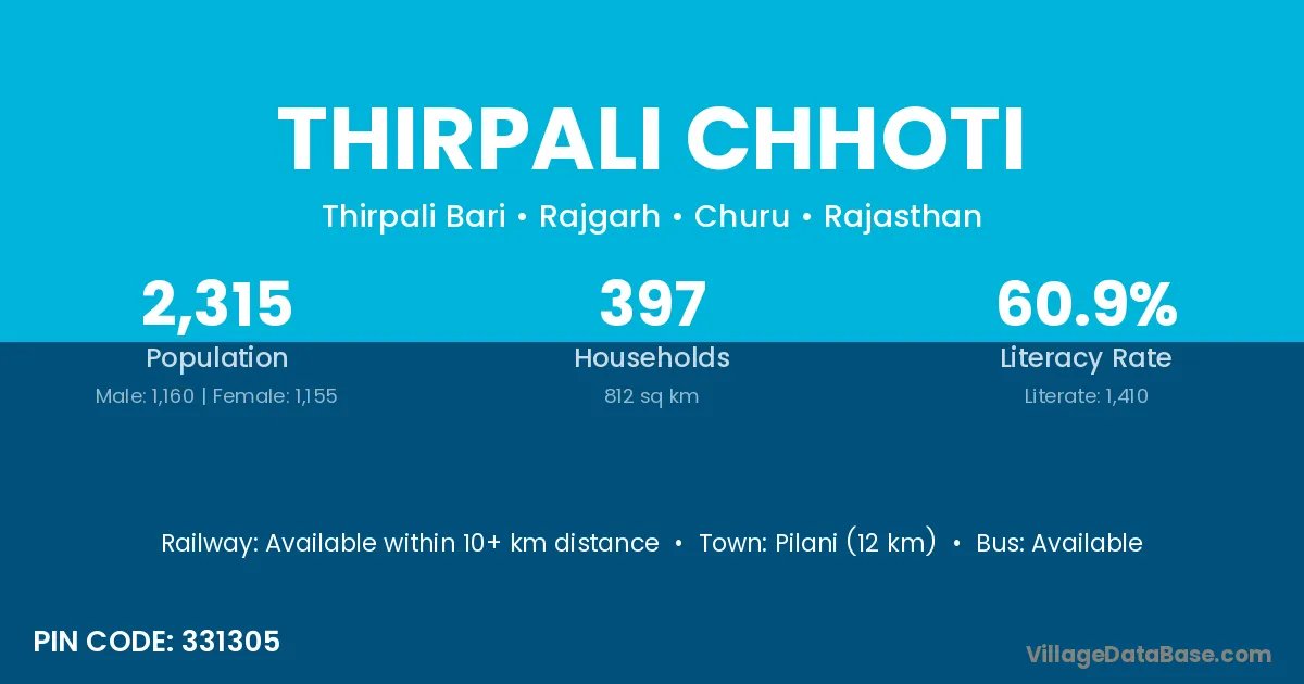 Pilani (12 km) is the nearest town to Thirpali Chhoti village for major economic activities and is located approximately 12 km away.