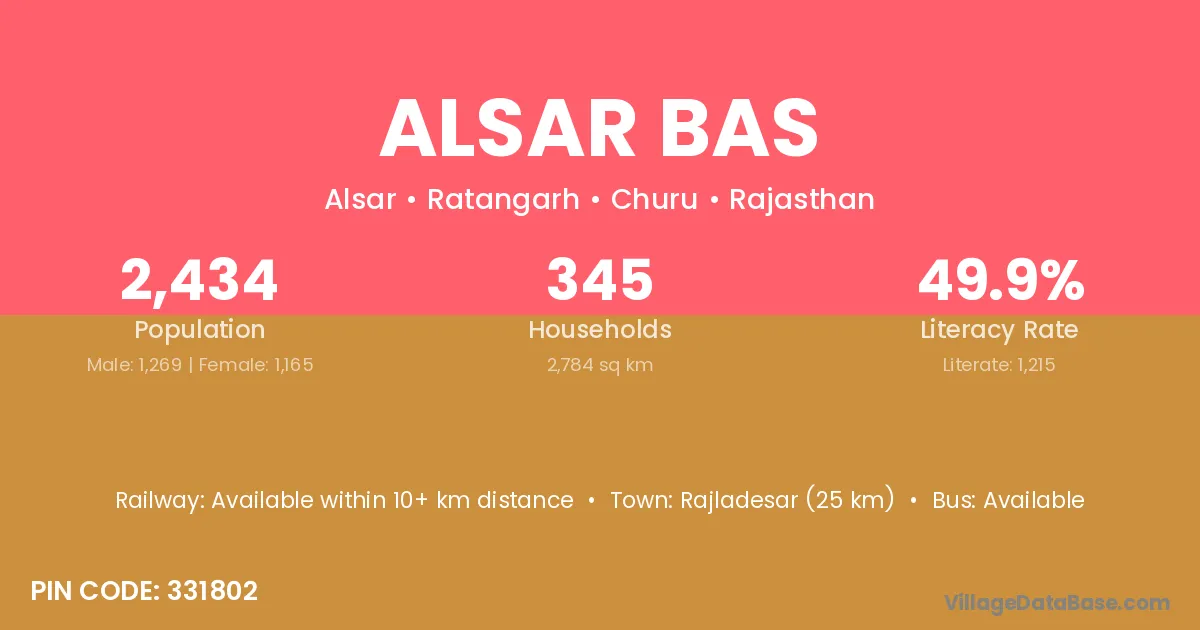Rajladesar (25 km) is the nearest town to Alsar Bas village for major economic activities and is located approximately 25 km away.