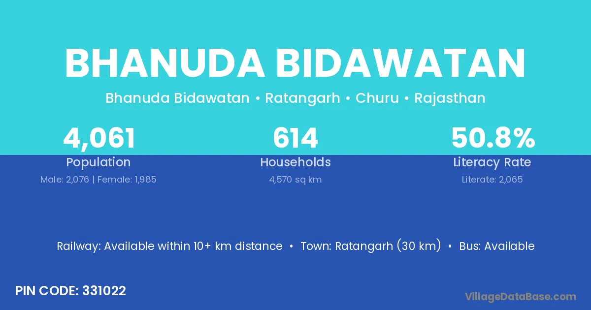 Ratangarh (30 km) is the nearest town to Bhanuda Bidawatan village for major economic activities and is located approximately 30 km away.