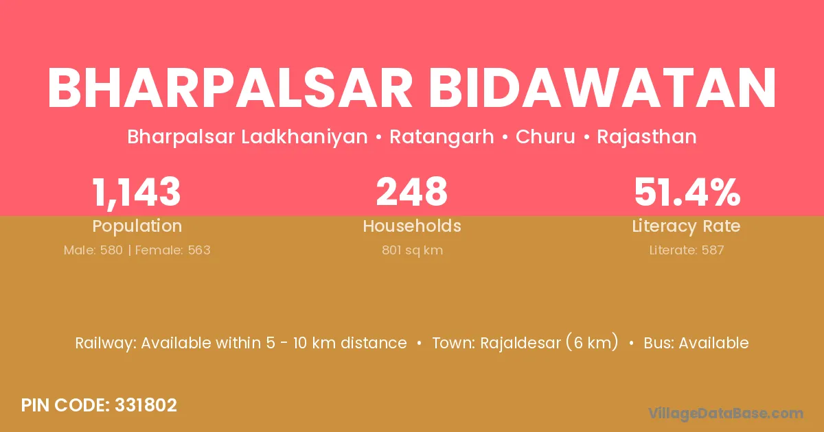 Rajaldesar (6 km) is the nearest town to Bharpalsar Bidawatan village for major economic activities and is located approximately 6 km away.