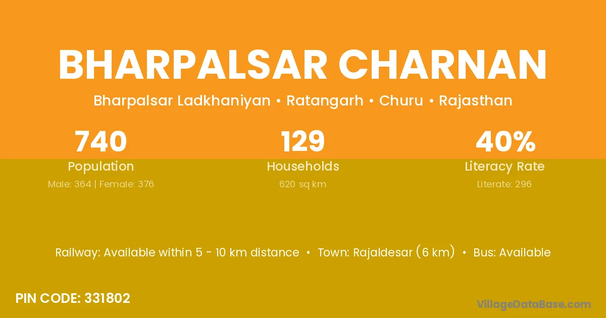Rajaldesar (6 km) is the nearest town to Bharpalsar Charnan village for major economic activities and is located approximately 6 km away.