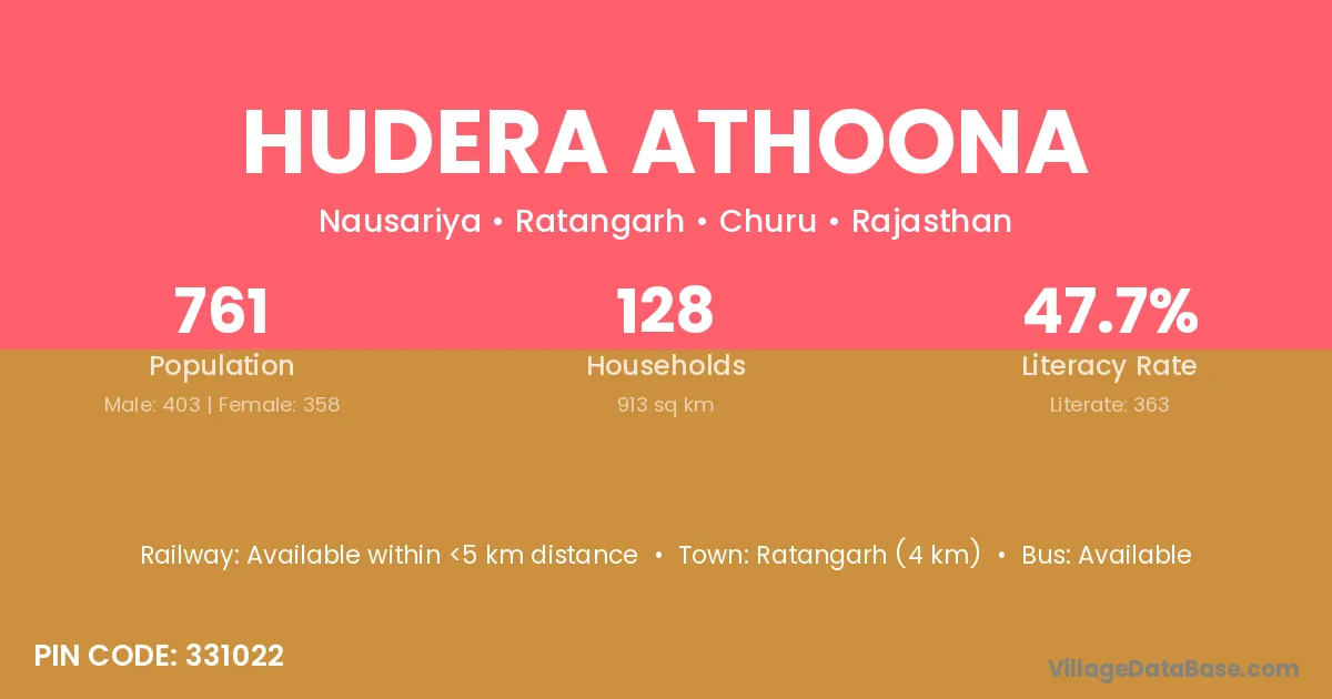Ratangarh (4 km) is the nearest town to Hudera Athoona village for major economic activities and is located approximately 4 km away.