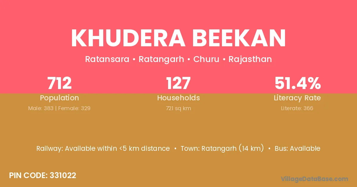 Ratangarh (14 km) is the nearest town to Khudera Beekan village for major economic activities and is located approximately 14 km away.