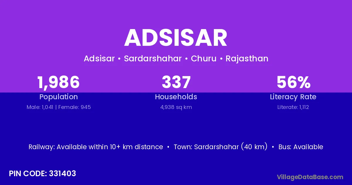 Sardarshahar (40 km) is the nearest town to Adsisar village for major economic activities and is located approximately 40 km away.