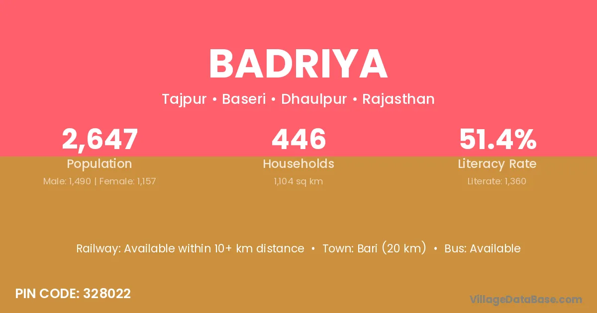 Sardarshahar (28 km) is the nearest town to Badriya village for major economic activities and is located approximately 28 km away.