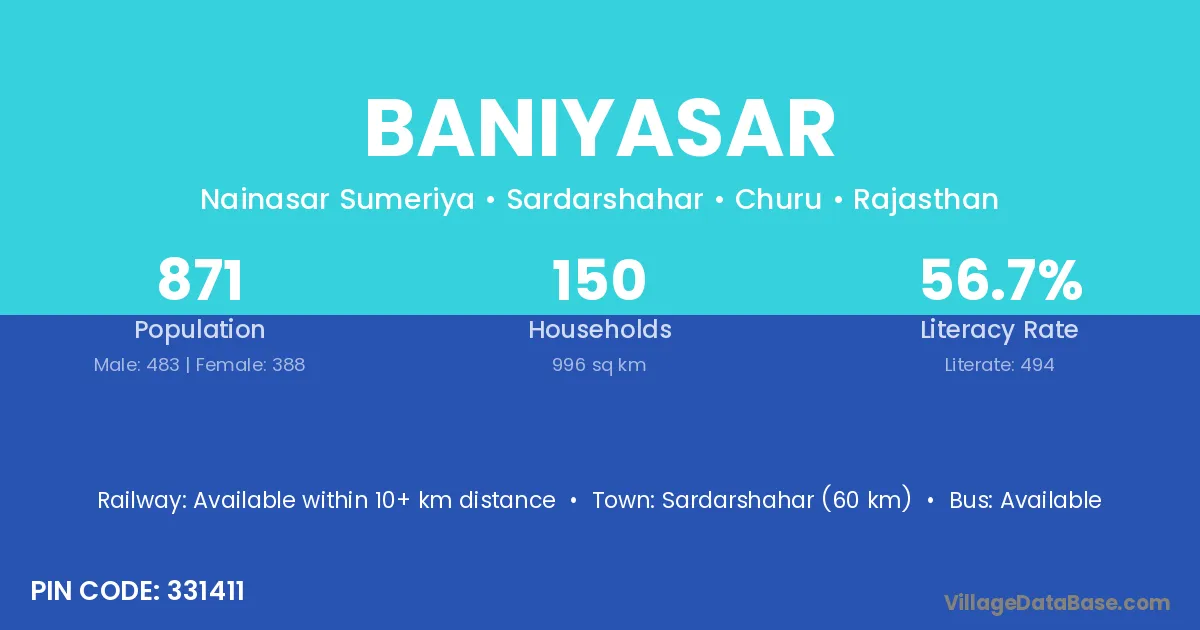 Sardarshahar (60 km) is the nearest town to Baniyasar village for major economic activities and is located approximately 60 km away.