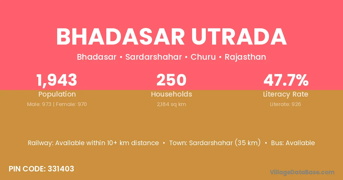 Sardarshahar (35 km) is the nearest town to Bhadasar Utrada village for major economic activities and is located approximately 35 km away.
