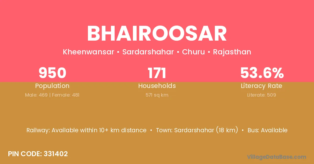 Bhairoosar village has a total population of 950 people, of which 469 are males and 481 are females.