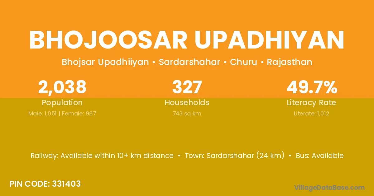 Sardarshahar (24 km) is the nearest town to Bhojoosar Upadhiyan village for major economic activities and is located approximately 24 km away.