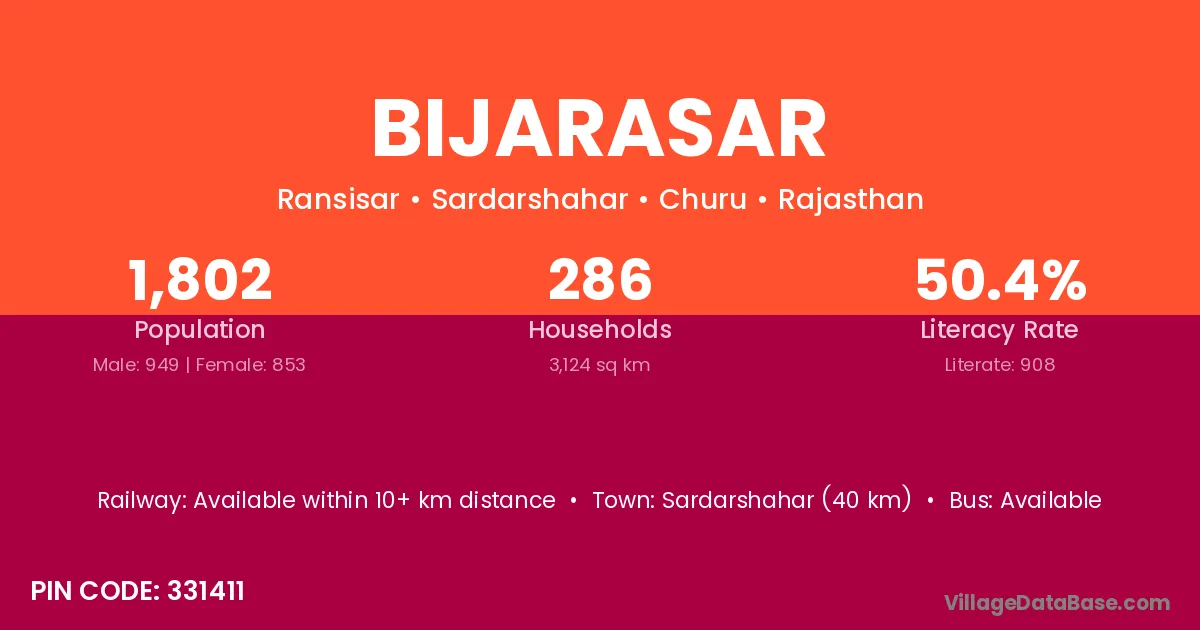 Sardarshahar (40 km) is the nearest town to Bijarasar village for major economic activities and is located approximately 40 km away.