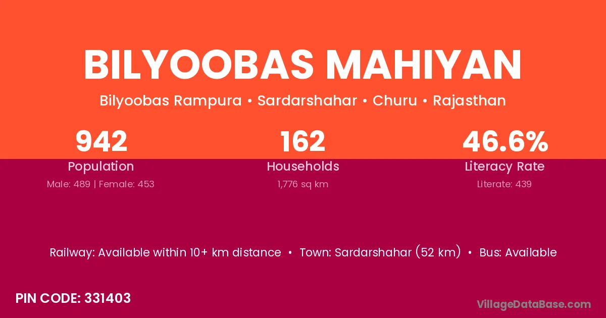Bilyoobas Mahiyan village has a total population of 942 people, of which 489 are males and 453 are females.