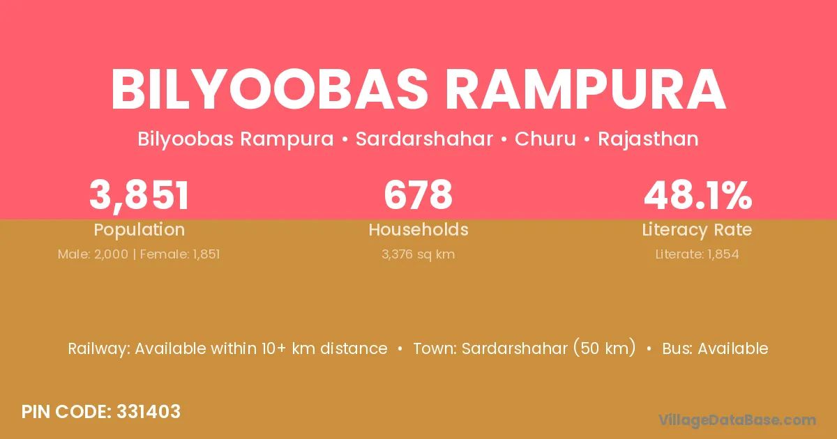 Sardarshahar (50 km) is the nearest town to Bilyoobas Rampura village for major economic activities and is located approximately 50 km away.