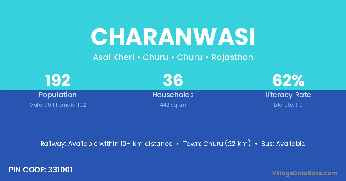 Sardarshahar (41 km) is the nearest town to Charanwasi village for major economic activities and is located approximately 41 km away.