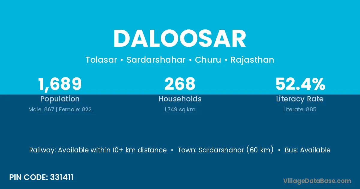 Sardarshahar (60 km) is the nearest town to Daloosar village for major economic activities and is located approximately 60 km away.