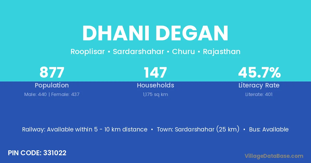 Dhani Degan village has a total population of 877 people, of which 440 are males and 437 are females.
