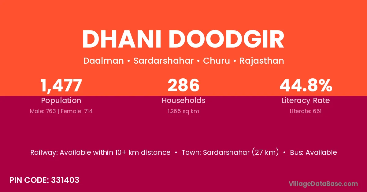 Sardarshahar (27 km) is the nearest town to Dhani Doodgir village for major economic activities and is located approximately 27 km away.