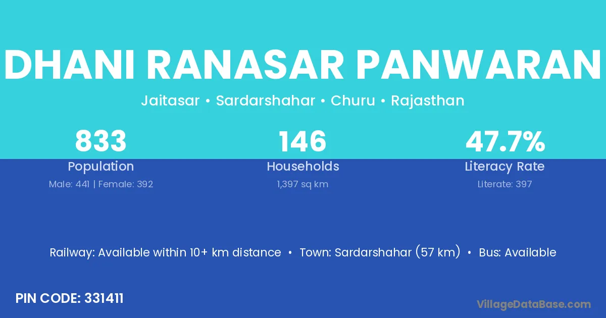 Dhani Ranasar Panwaran village has a total population of 833 people, of which 441 are males and 392 are females.