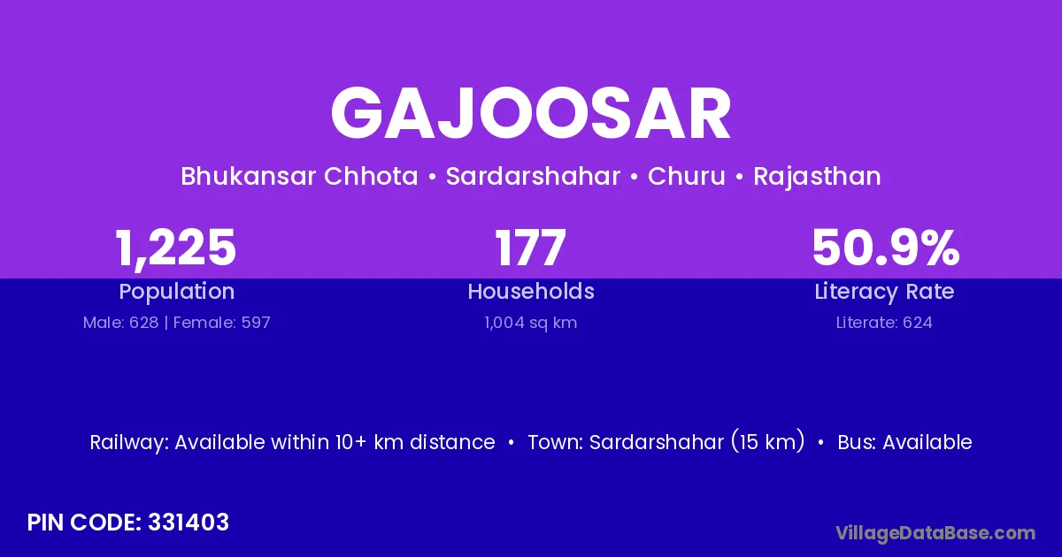 Sardarshahar (15 km) is the nearest town to Gajoosar village for major economic activities and is located approximately 15 km away.