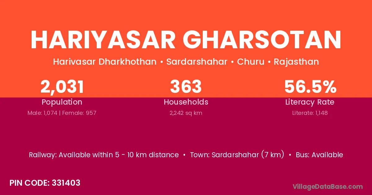 Hariyasar Gharsotan village has a total population of 2,031 people, of which 1,074 are males and 957 are females.
