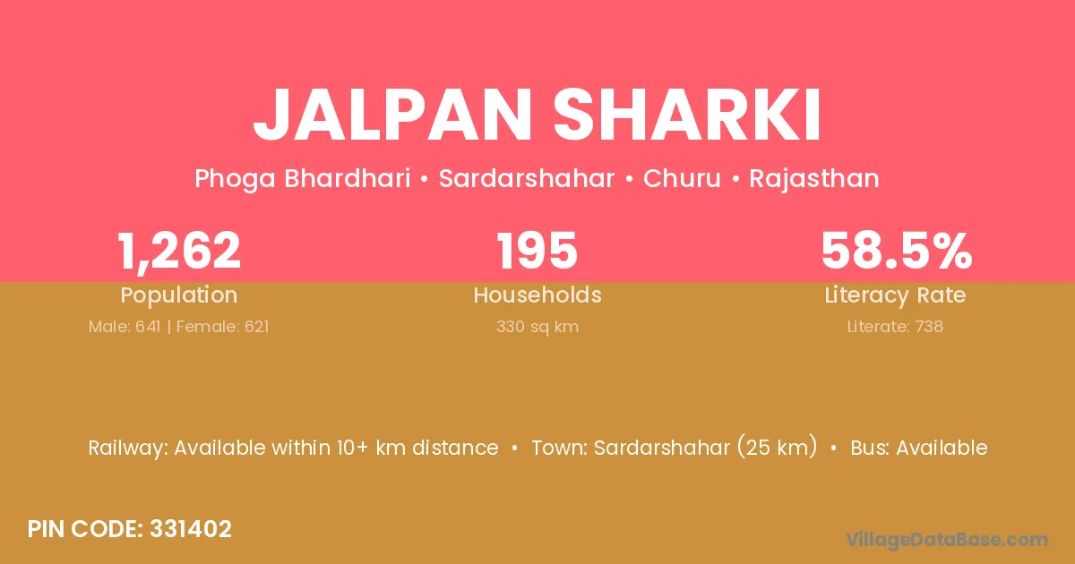 Sardarshahar (25 km) is the nearest town to Jalpan Sharki village for major economic activities and is located approximately 25 km away.