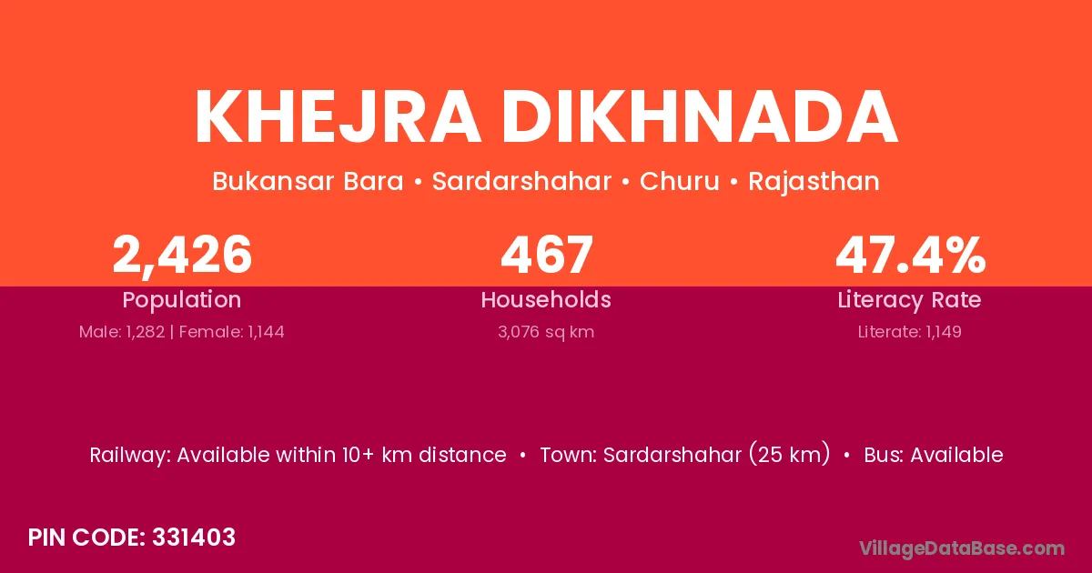 Sardarshahar (25 km) is the nearest town to Khejra Dikhnada village for major economic activities and is located approximately 25 km away.
