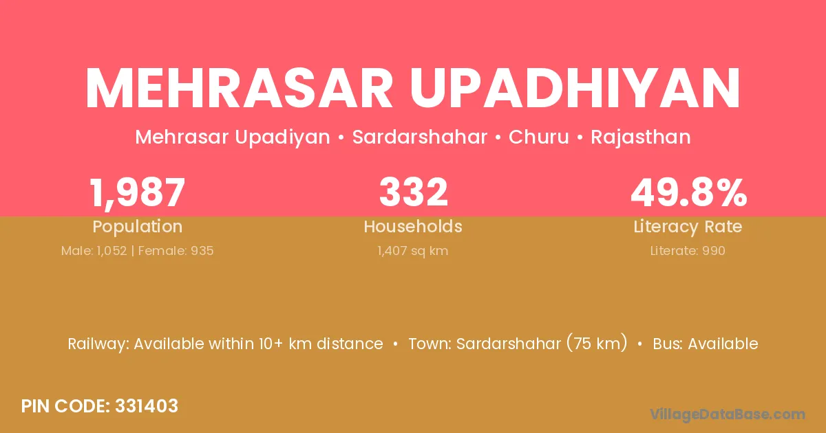 Sardarshahar (75 km) is the nearest town to Mehrasar Upadhiyan village for major economic activities and is located approximately 75 km away.