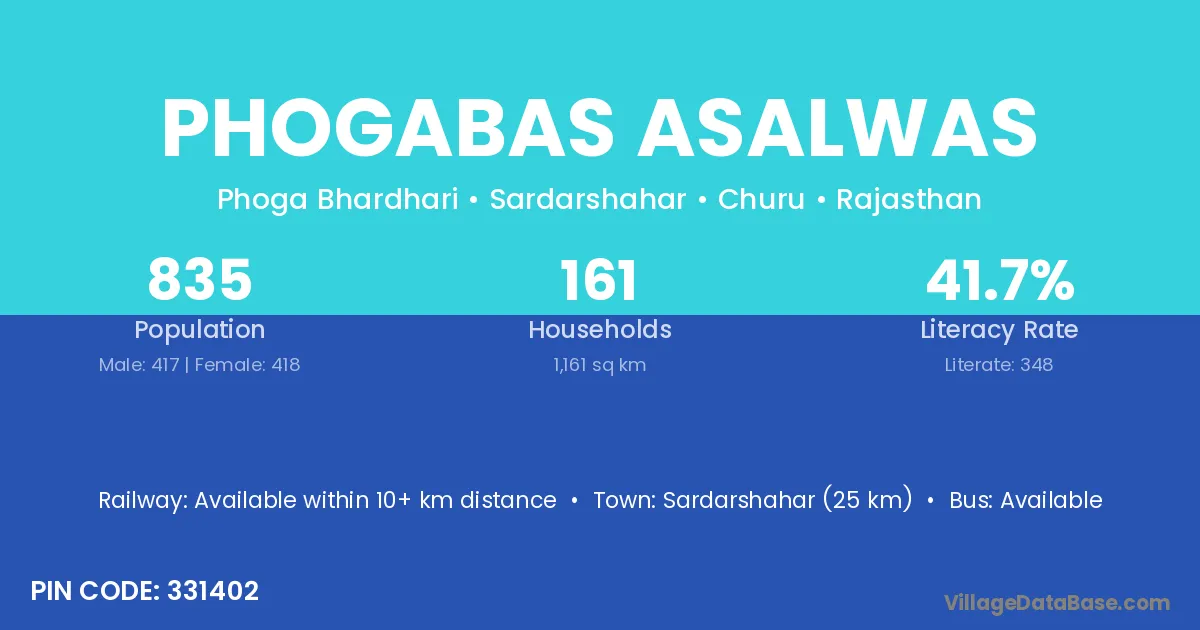 Sardarshahar (25 km) is the nearest town to Phogabas Asalwas village for major economic activities and is located approximately 25 km away.