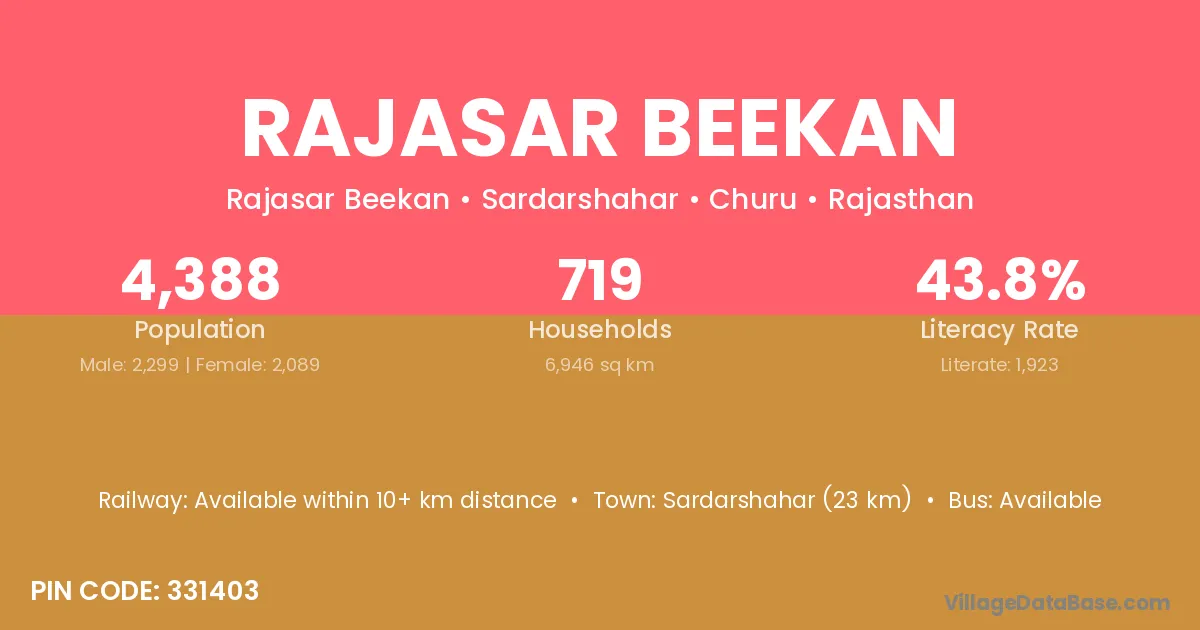 Sardarshahar (23 km) is the nearest town to Rajasar Beekan village for major economic activities and is located approximately 23 km away.