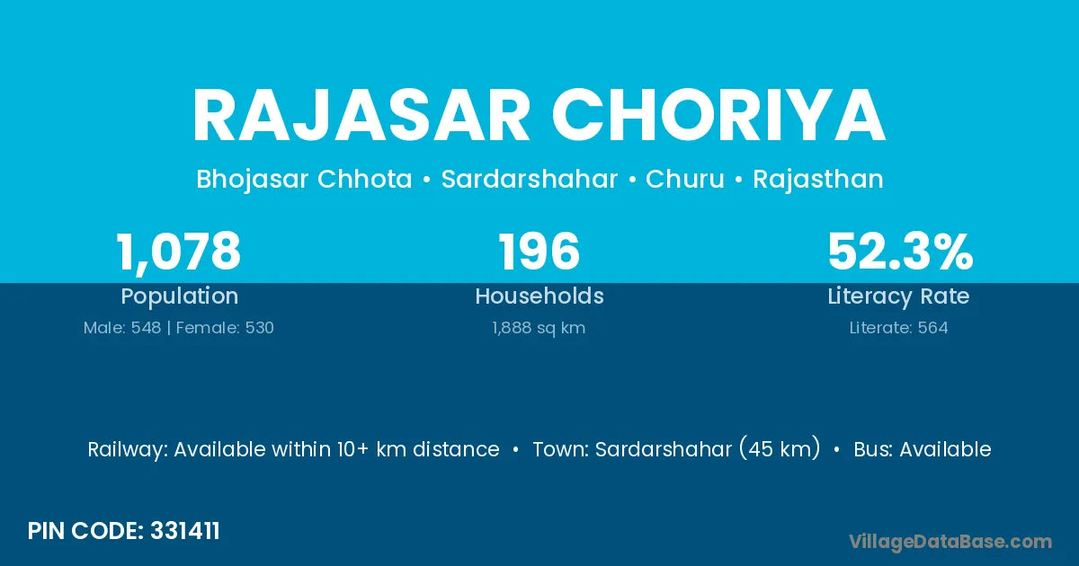 Rajasar Choriya village has a total population of 1,078 people, of which 548 are males and 530 are females.