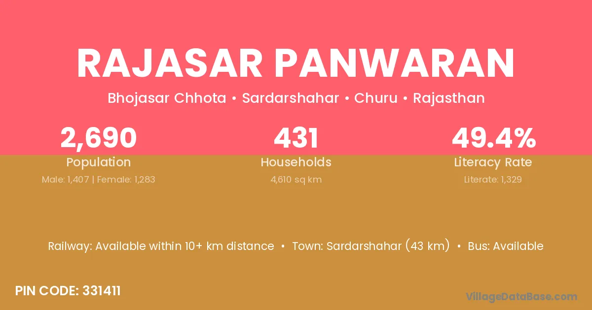 Sardarshahar (43 km) is the nearest town to Rajasar Panwaran village for major economic activities and is located approximately 43 km away.