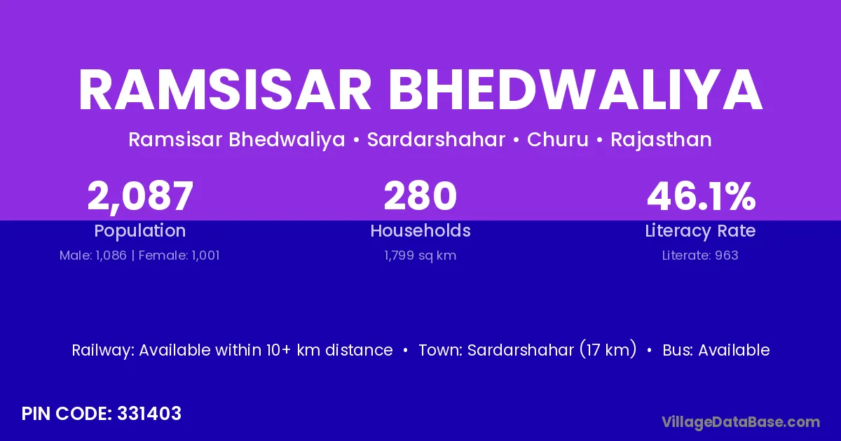 Ramsisar Bhedwaliya village has a total population of 2,087 people, of which 1,086 are males and 1,001 are females.