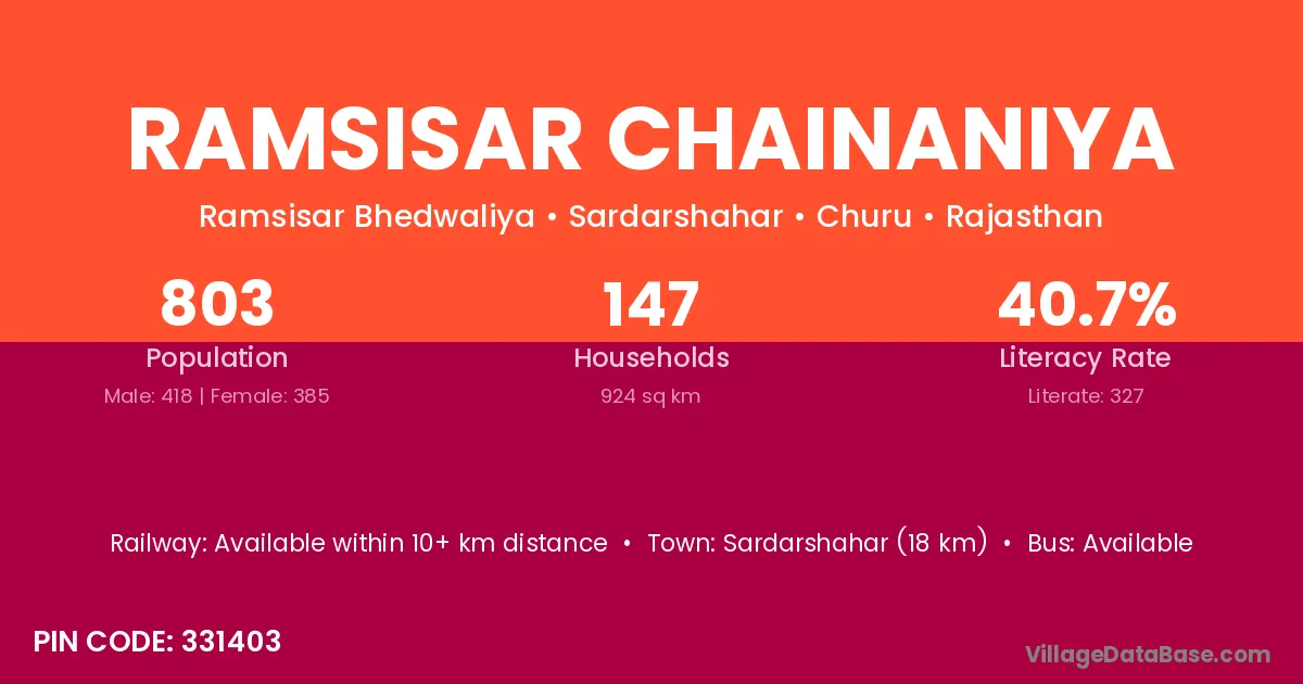 Ramsisar Chainaniya village has a total population of 803 people, of which 418 are males and 385 are females.