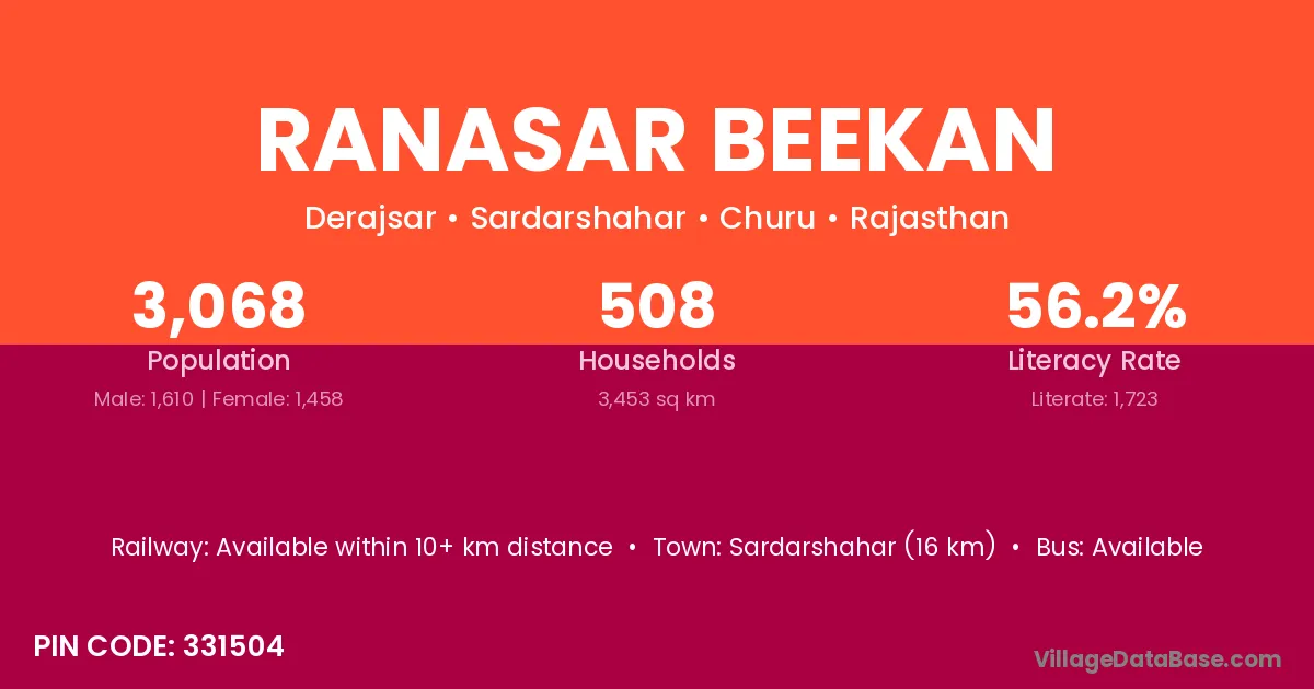 Sardarshahar (16 km) is the nearest town to Ranasar Beekan village for major economic activities and is located approximately 16 km away.