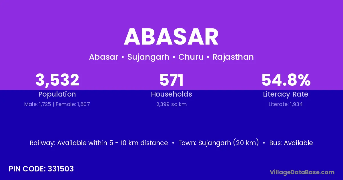 Sujangarh (20 km) is the nearest town to Abasar village for major economic activities and is located approximately 20 km away.