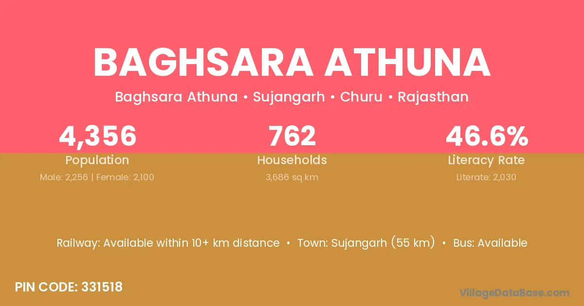 Sujangarh (55 km) is the nearest town to Baghsara Athuna village for major economic activities and is located approximately 55 km away.