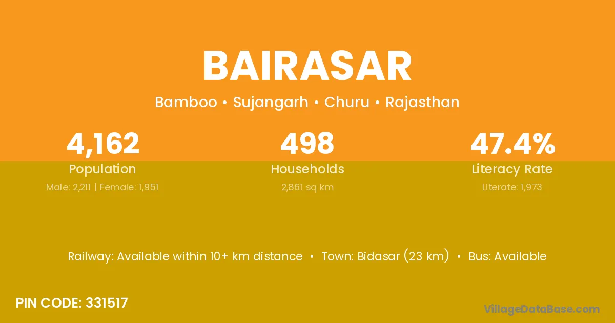 Bidasar (23 km) is the nearest town to Bairasar village for major economic activities and is located approximately 23 km away.