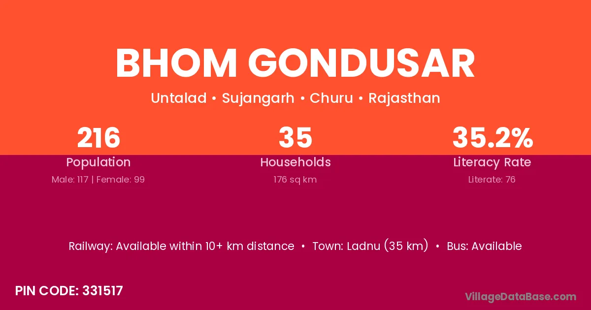 Ladnu (35 km) is the nearest town to Bhom Gondusar village for major economic activities and is located approximately 35 km away.