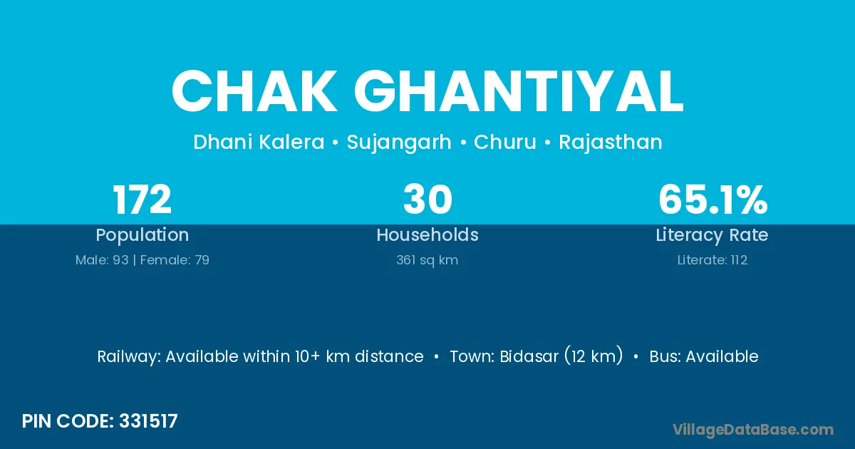 Bidasar (12 km) is the nearest town to Chak Ghantiyal village for major economic activities and is located approximately 12 km away.