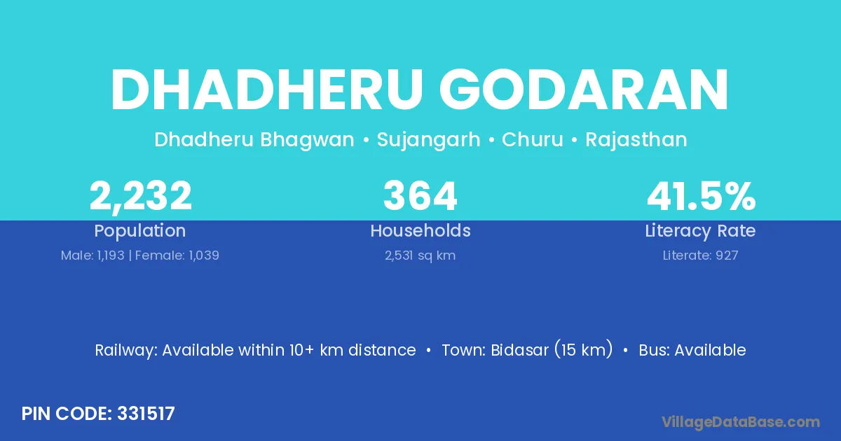Bidasar (15 km) is the nearest town to Dhadheru Godaran village for major economic activities and is located approximately 15 km away.