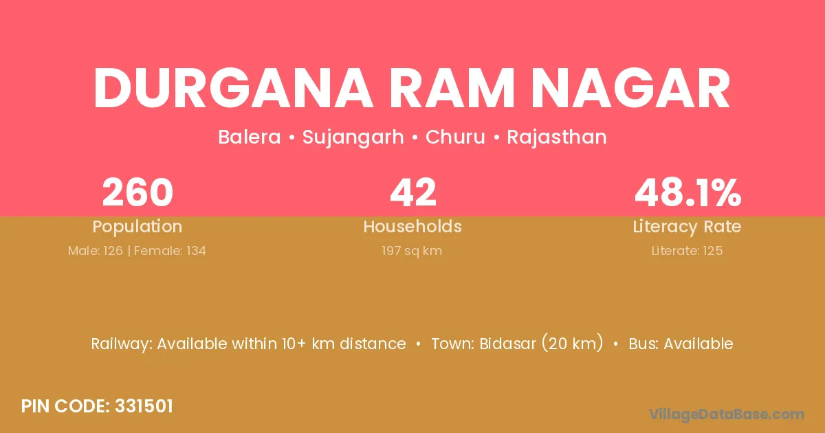 Bidasar (20 km) is the nearest town to Durgana Ram Nagar village for major economic activities and is located approximately 20 km away.