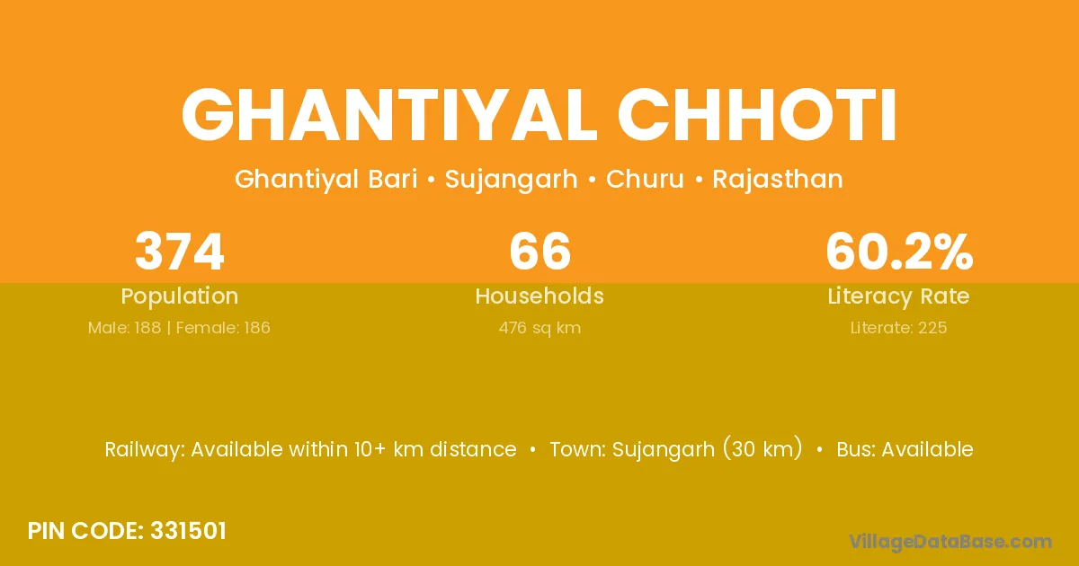 Sujangarh (30 km) is the nearest town to Ghantiyal Chhoti village for major economic activities and is located approximately 30 km away.